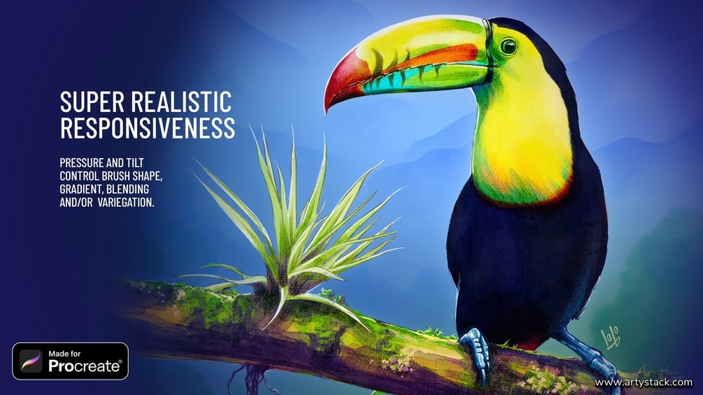 Forget about repetitive stamp-based watercolor brushes. We have taken the Procreate brush engine to the next level. You can now get beautiful responsive, pressure and tilt sensitive, super realistic brushes. Get unique strokes every time with ArtyStack's Watercolor Bundle.